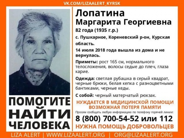 Поисковый отряд [URL= https://vk.com/lizaalert_kyrsk]«Лиза Алерт Курск»[/URL] сообщил об исчезновении 82-летней жительницы села Пушкарное Кореневского района.