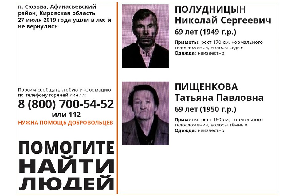 В поселке Сюзьва Афанасьевского района пропали пожилые супруги. Николай и Татьяна Полудницыны в субботу, 27 июля 2019 года, ушли в лес по грибы, но до сих пор не вернулись. Мужчине и женщине 69 лет.