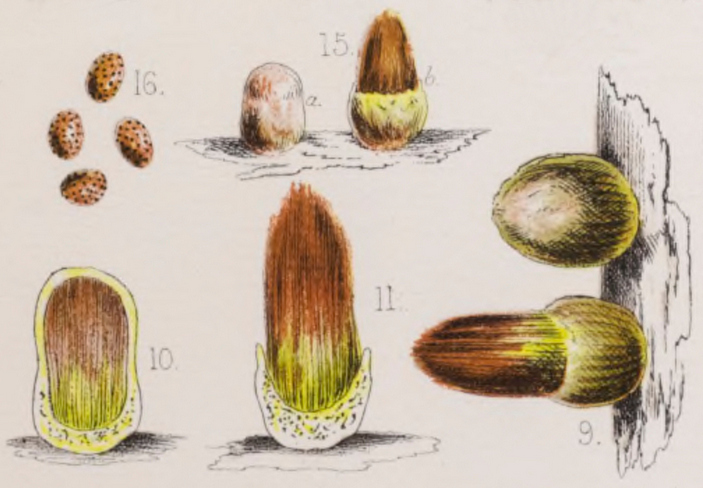 Грибы Trichocoma paradoxa: 9 — незрелое (вверху) и зрелое плодовые тела. 10 — срез гриба до разрыва перидия; 11 — срез после разрыва перидия. Trichocoma levispora: 15a — до разрыва перидия; 15b — после разрыва перидия; 16 — аскоспоры (увеличение 600x). Изображение из статьи G. Massee, 1887. On gasterolichenes: a new type of the group lichenes