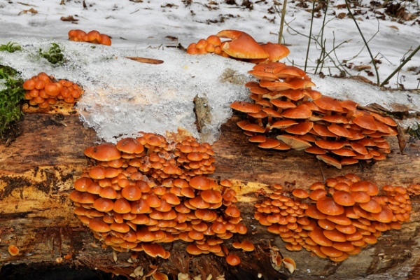 Фламмулина появляется с первым серьезным похолоданием и растет до весны. Это съедобный гриб. Зимние опята видны издалека – они оранжевого цвета.