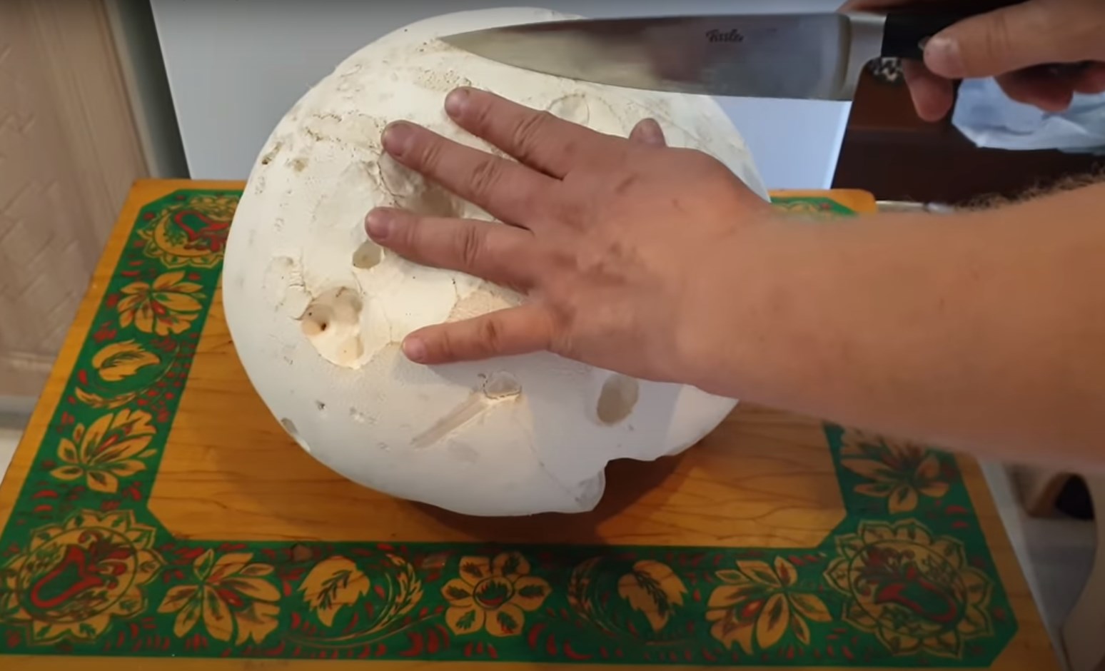 Грибник взвесил один экземпляр: 2 кг 300 грамм. Грибы молочно-белые, похожи на гигантские шляпки шампиньонов. Грибной «мяч» держится на тонкой крепкой ножке — ее нужно перепилить, чтобы забрать головача.